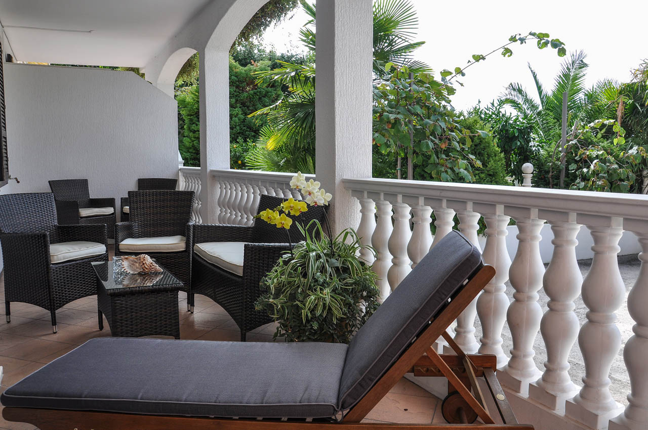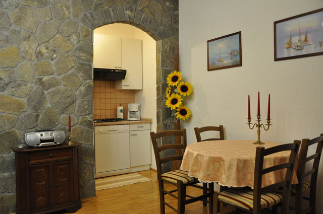 Appartement C (40 m²)    : Klimaanlage, Internet WiFi, LED-kabel-TV, Mikrowellenherd, Küchlschrank-Gefrierraum, Induktionskochfeld, Kaffemaschine, Toaster, Elektro-Grill, Spülmaschine, (Waschmaschine und Trockner in der Waschküche) Bügeleisen, Bügelbrett, Trocknenhaube, Stilmöbel, Wohnzimmer - Zofabett, Schlafzimmer – Doppelbett 180 x 200, kleine Küche, Badezimmer mit Badewanne, eine überdachte Terrasse.